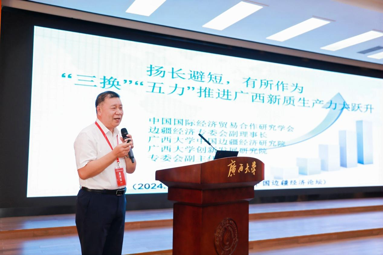在主旨报告环节,广西壮族自治区党委政策研究室(改革办)原副主任苏满勇,全球化智库(CCG)高级研究员、商务部亚洲司原司长吕克俭,广西财经学院校长夏飞,国务院发展研究中心对外经济研究部第一研究室主任胡江云,广西大学中国边疆经济研究院院长、中国国际经济合作学会副会长兼边疆经济合作专委会主任李光辉等学者分别作了《扬长避短,有所作为——“三换”“五力”推进广西新质生产力跃升》《中国与亚洲国家经贸合作现状与展望》《新质生产力赋能广西沿边临港产业高质量发展》《我国与东盟的中间品贸易》《数字经济赋能边疆经济高质量发展研究》等报告。