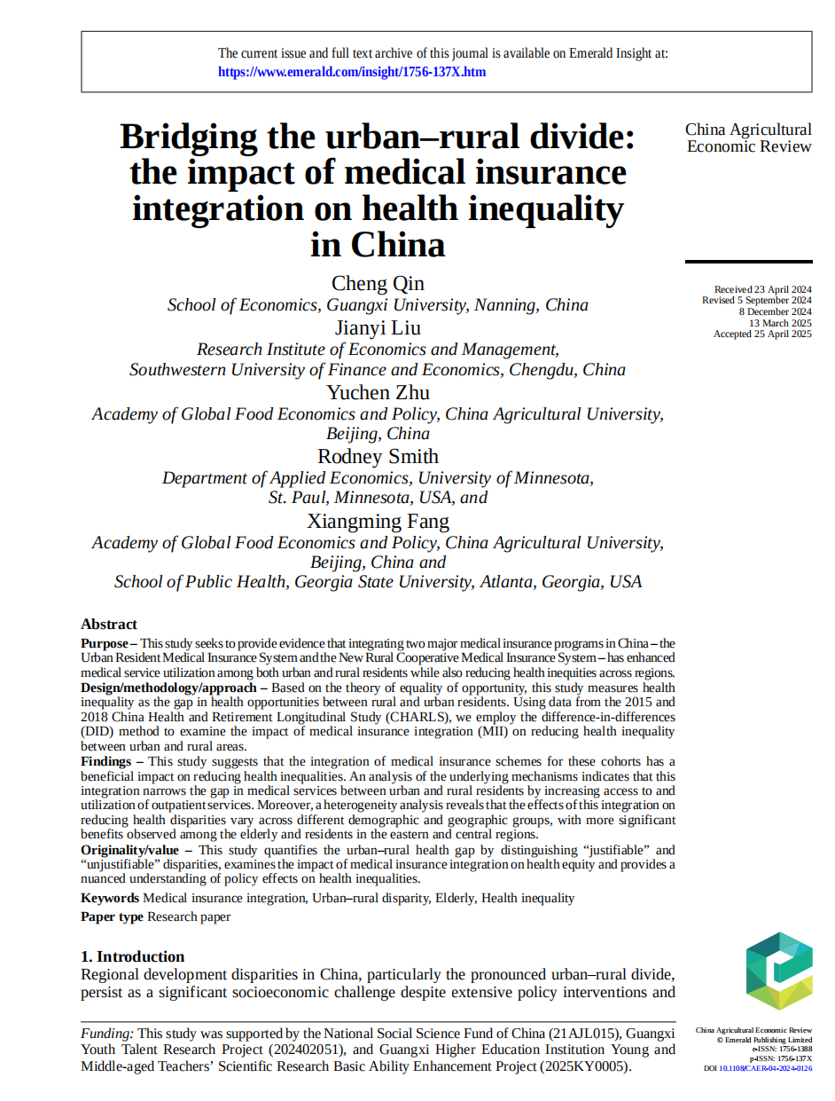 近日,我院覃诚助理教授与中国农业大学方向明教授、明尼苏达大学Rodney Smith教授等人合作的论文《Bridging the urban-rural divide: the impact of medical insurance integration on health inequality in China》在《China Agricultural Economic Review》期刊2025年8月刊发表。覃诚助理教授为论文第一作者,方向明教授为论文通讯作者。