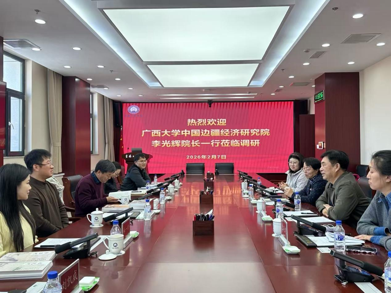 为深化边疆经济研究领域的校际合作,凝聚学术共识,共话发展新机,2026年2月7日,广西大学经济学院学术院长、中国边疆经济研究院李光辉院长带队一行6人赴吉林工商学院进行交流座谈。座谈会由吉林工商学院副校长张熙奀主持。